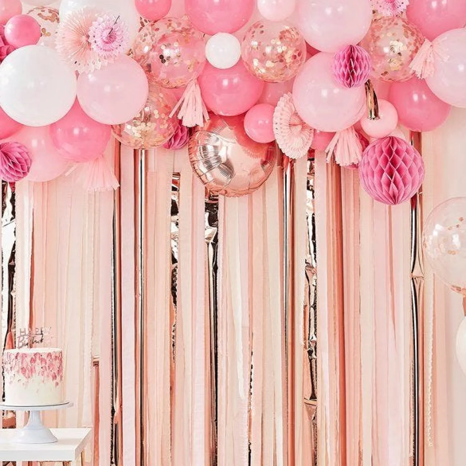 - Mix Of 70 X 5″ & 12″ Latex Balloons In White, Pink And Rose Gold Confetti.