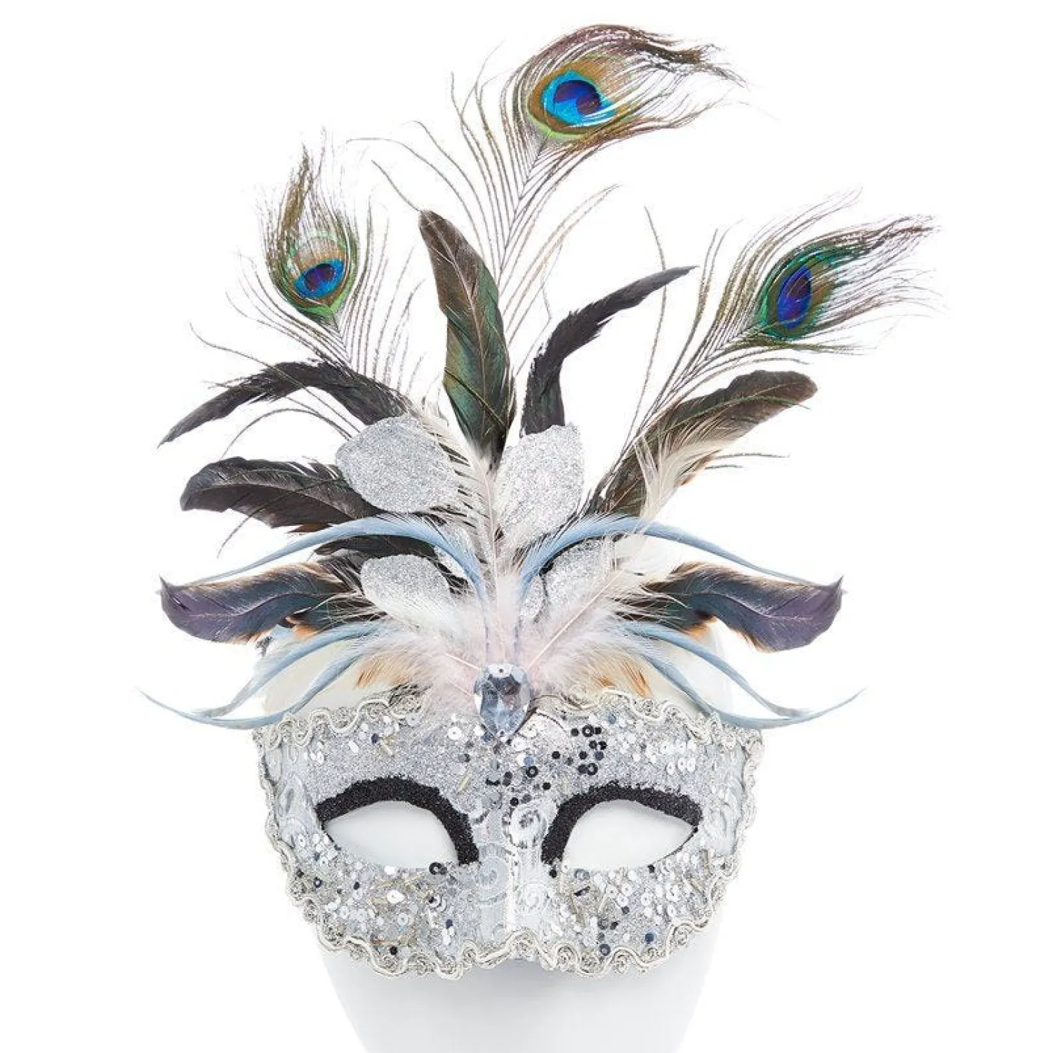This Beautifully Detailed Masquerade Mask Is Sure To Turn Heads At Any Party! From The All Over Sparkly, Silver, Sequin Detail To The Spectacular, Peacock Feathered Plumage Which Stands Upright From The Centre, It Has All The Ingredients Needed For A Classy Masquerade Party.