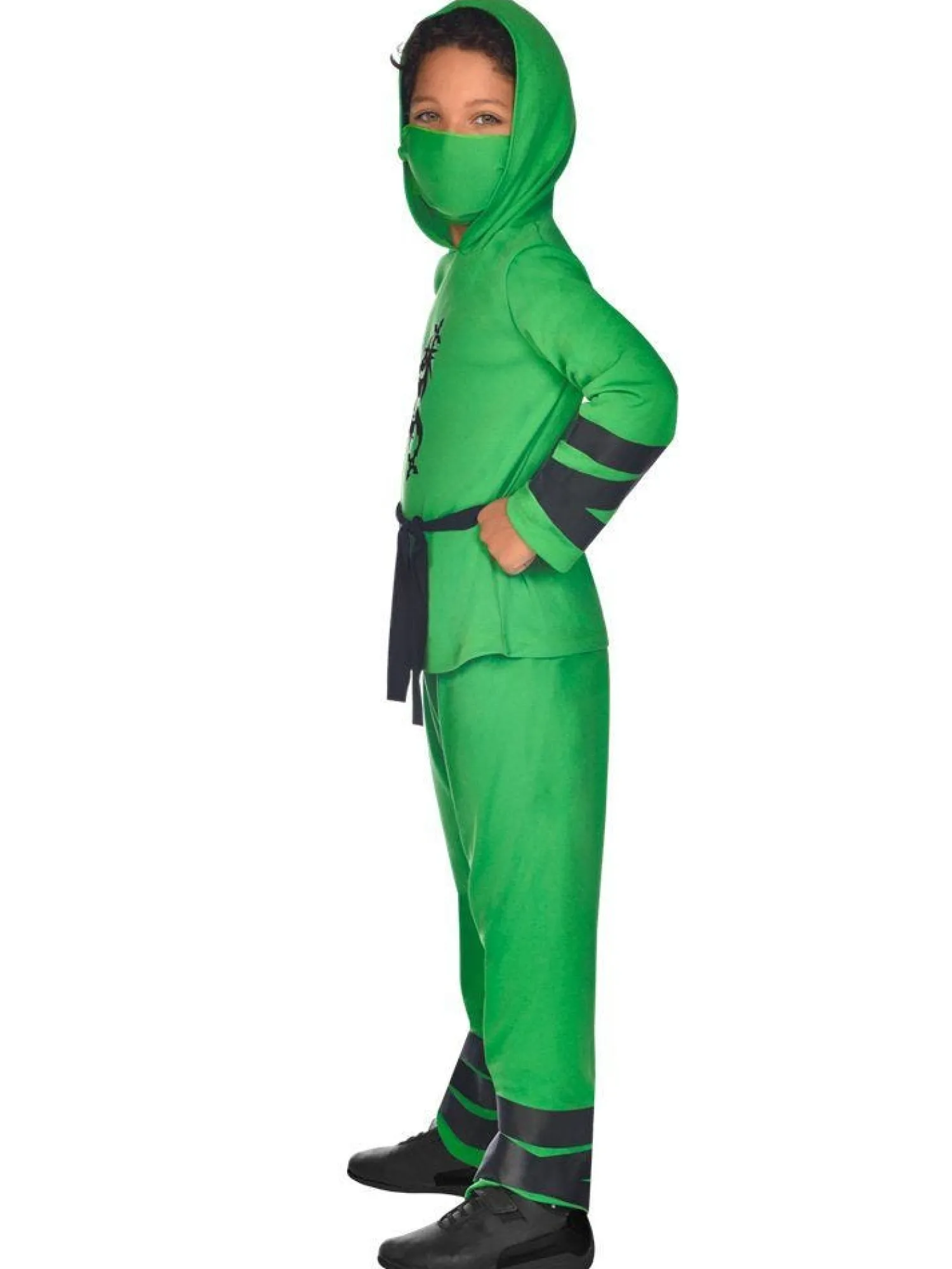 Ready To Battle? This Green And Black Ninja Warrior Costume Features A Hooded Top With Dragon Print To Front, And Arm Tie Printed Detail. A Pair Of Trousers With A Comfortable Elasticated Waist And Printed Leg Tie Detail And A Belt And Face Covering Completes The Ninja Look.