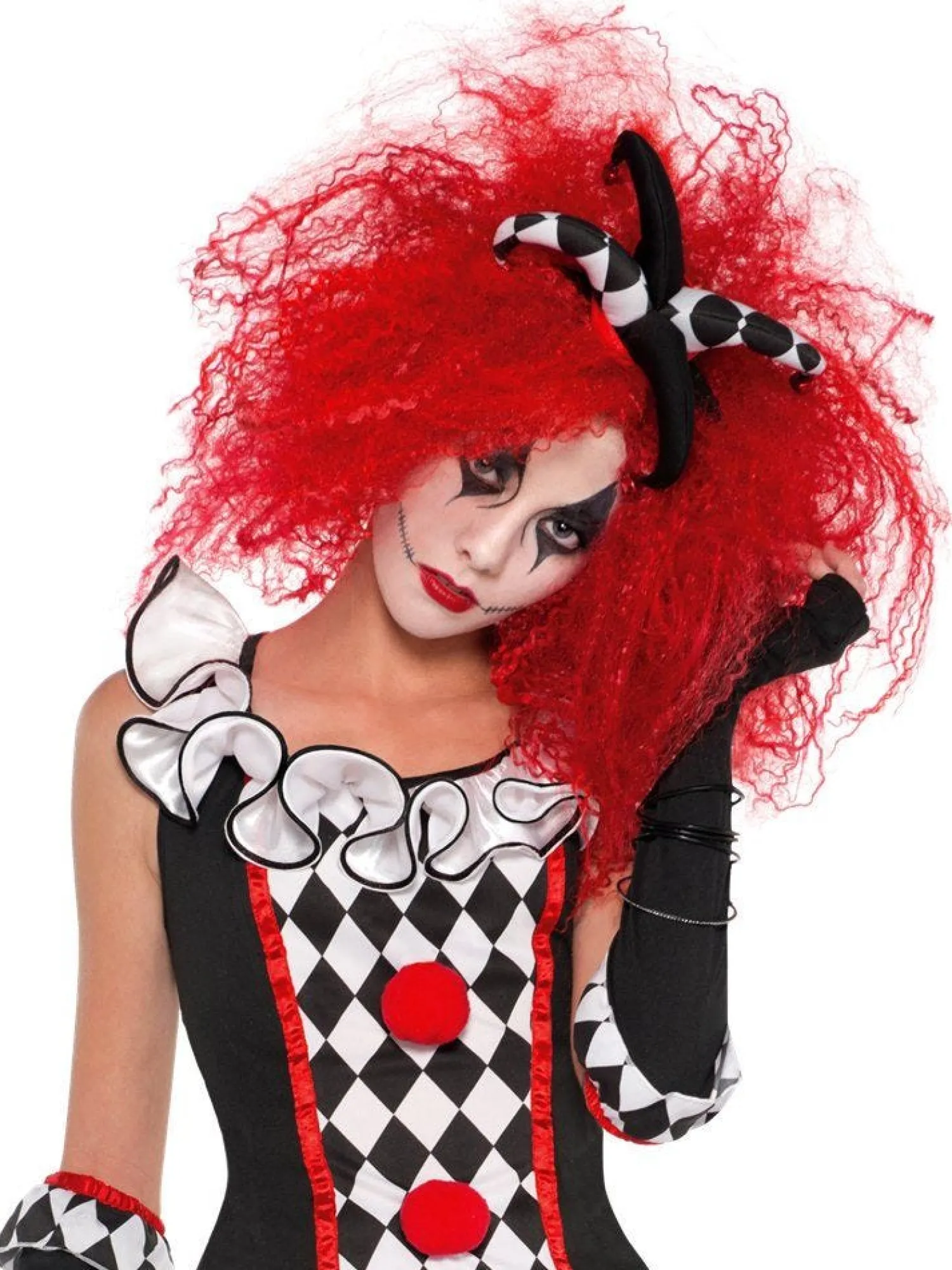 This Gorgeous Harlequin Honey Costume Is Great For Those Feeling A Little Mischievous This Halloween! A Cute Clown Dress In Black And White With Red Accents Featuring A White Tutu And A Pair Of Diamond-Pattern Footless Tights, As Well As Fingerless Gloves And Adorable Jester Hat On A Headband Which Jingles As You Move. Have Fun Experimenting With Your Clown Makeup For This Iconic Look.