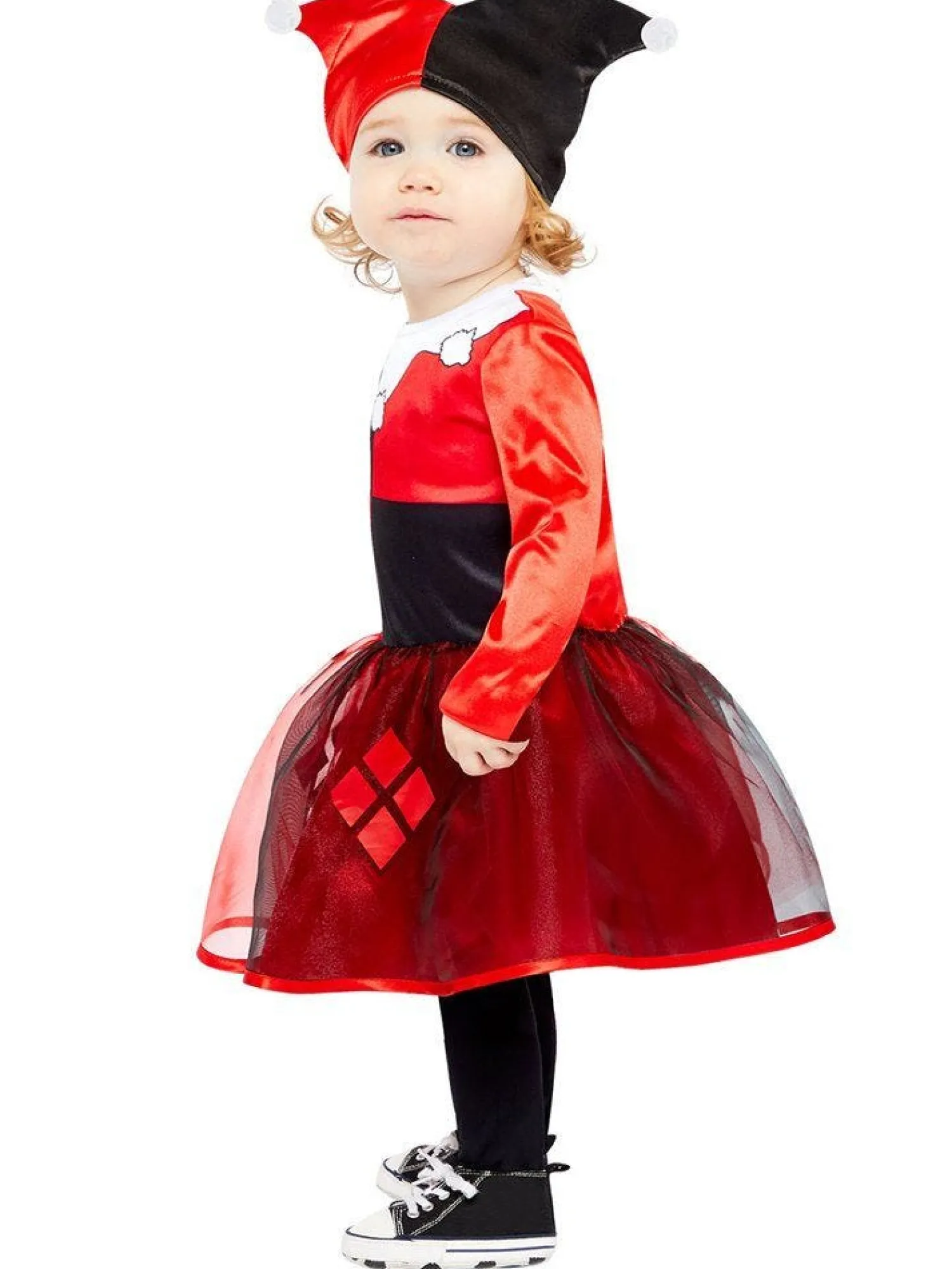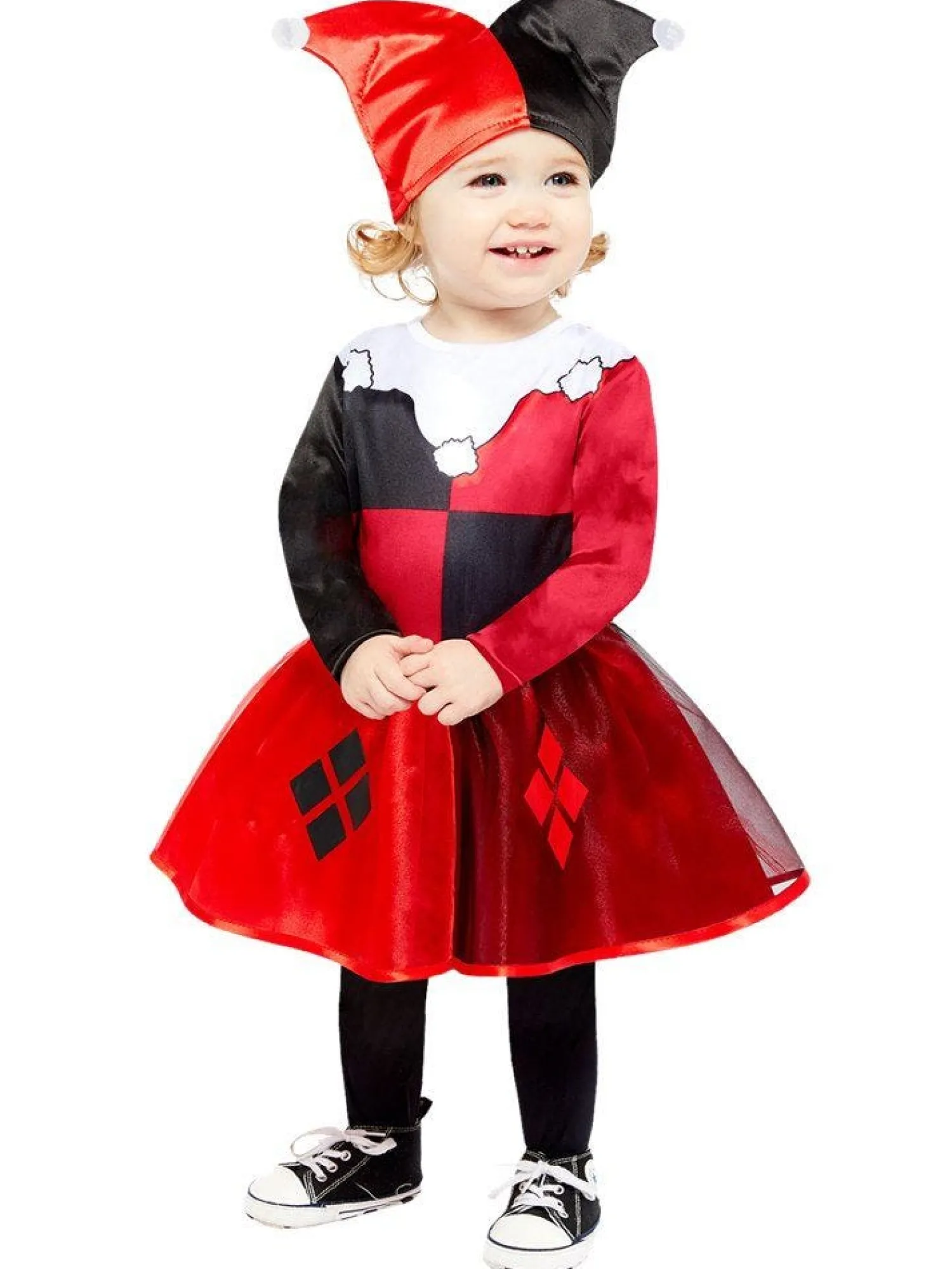Uh Oh, Here’s Trouble – This Gorgeous Officially Licensed Harley Quinn Costume Is Taken Straight From The Pages Of A Batman Comic. The Classic Harlequin Costume Comes As A Dress With Organza Printed Skirt And Black And Red Split Jester’s Hat.